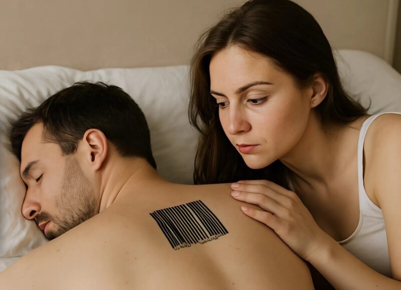 Alors qu’il bougeait dans son sommeil, j’ai remarqué une marque sur sa nuque — des traits noirs, nets, qui dessinaient comme un code-barres. Rien d’un tatouage ordinaire. Quelque chose de précis, presque technique.