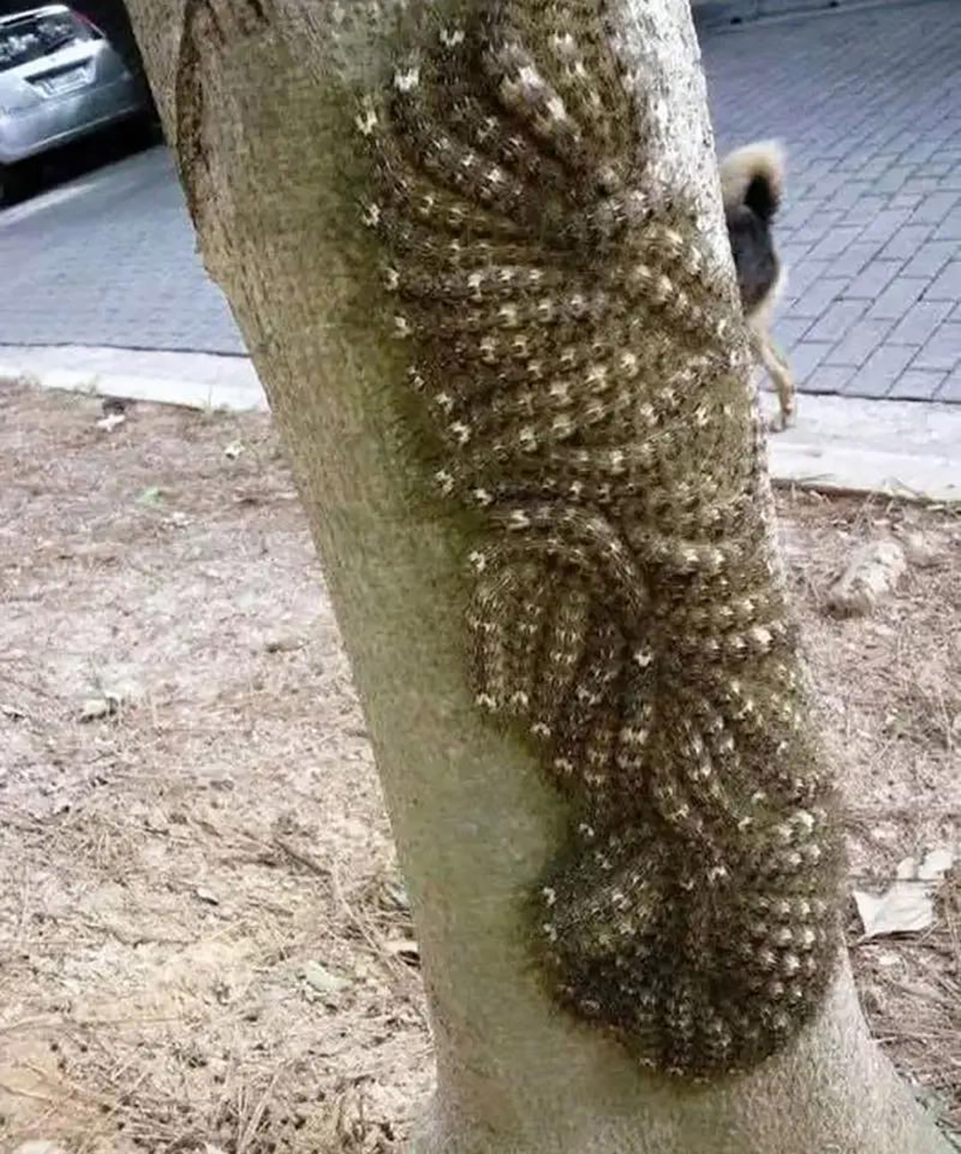 Leur technique de survie ? Un mimétisme parfait avec leur habitat. Collées contre l’écorce, ces créatures reproduisaient fidèlement l’apparence du bois. Il s’agissait de chenilles processionnaires, dont les poils invisibles à l’œil nu peuvent provoquer de sérieuses irritations.