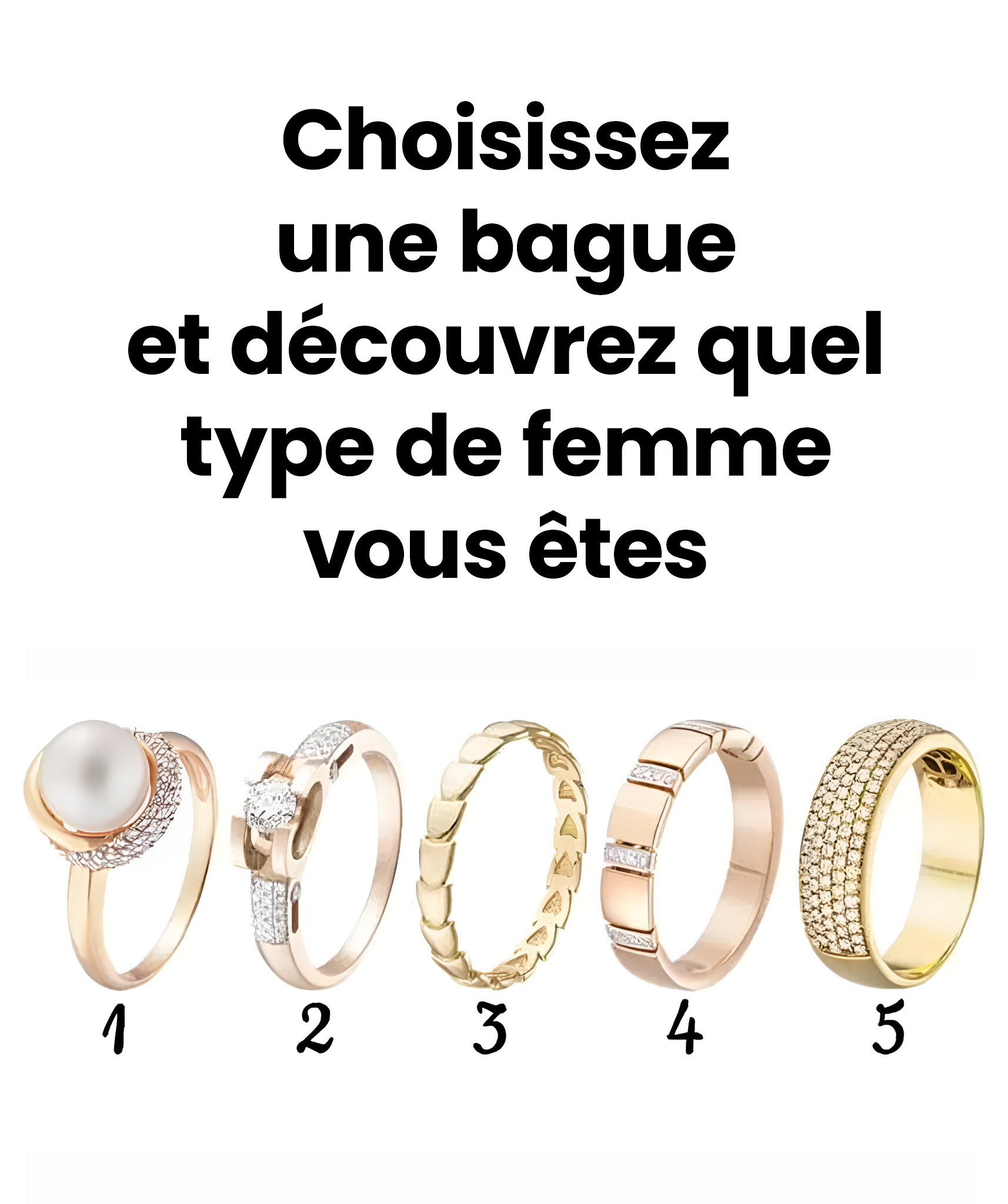 Découvrez ci-dessous cinq magnifiques modèles de bagues (ou consultez-les si l’image ne s’affiche pas), et laissez votre intuition choisir celle qui vous attire spontanément. Ensuite, explorez les traits de personnalité que ce choix révèle sur vous. Prête à commencer ? C’est parti !