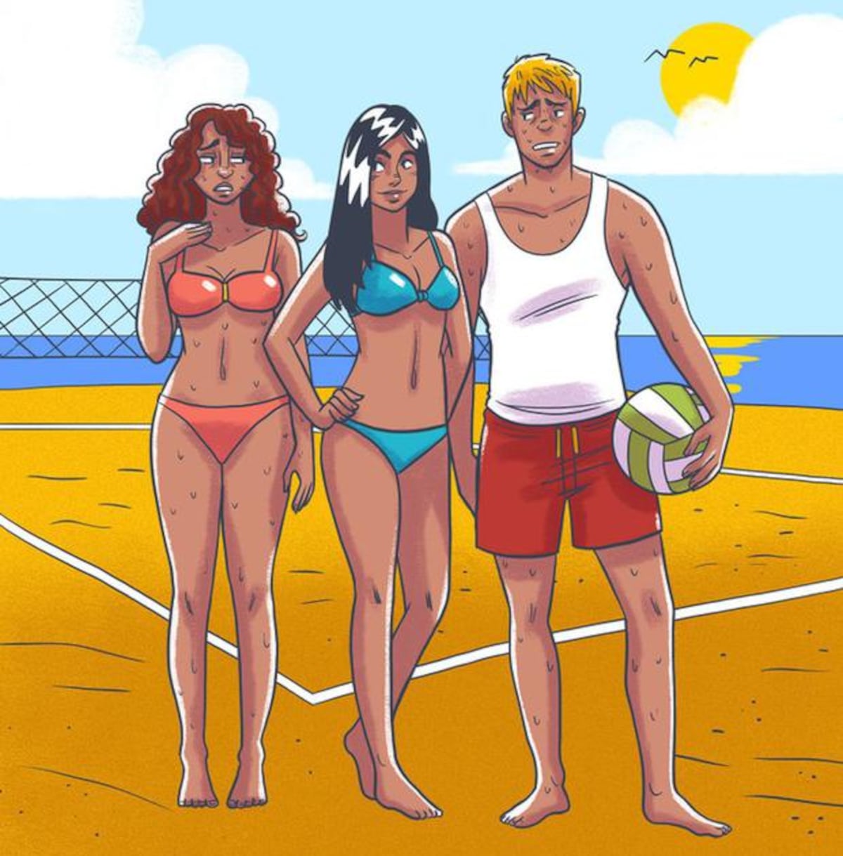 Observez minutieusement cette scène estivale. Trois personnes allongées sur le sable, équipées de leurs lunettes de soleil, habillées légèrement pour la saison, dans des postures détendues. Tout semble parfaitement normal à première vue.