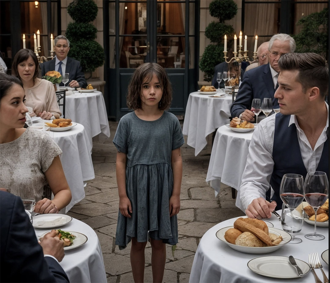 Un moment suspendu a suivi. Devant lui se tenait une jeune fille au regard épuisé, aux traits marqués par les épreuves, racontant sans un mot une enfance dérobée. À cet instant précis, Julien a reposé ses couverts… et a écouté son cœur.