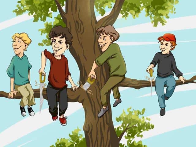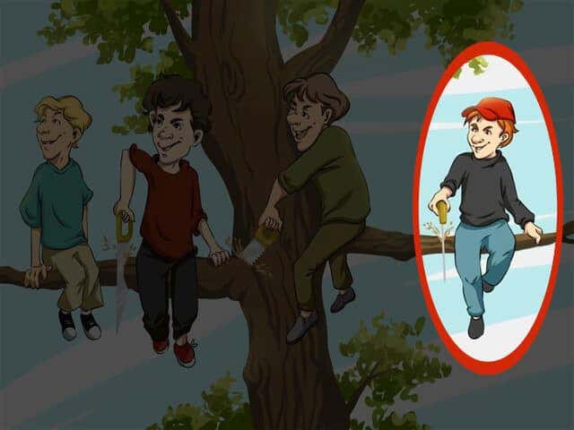 Si vous avez repéré le garçon au chapeau rouge (numéro 4) comme celui qui fait la plus grosse erreur, bravo ! C’est effectivement lui qui commet la méprise la plus évidente. Il scie directement la branche qui le supporte, ce qui le condamne inévitablement à tomber.
