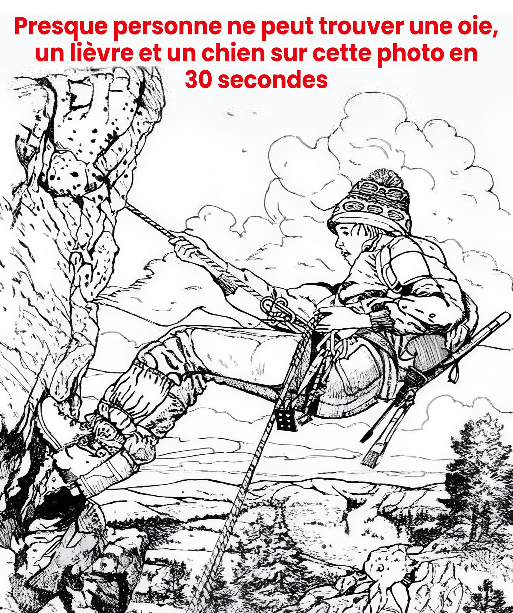 Dans cette image, le dessinateur exploite les oppositions de lumière et d’obscurité du paysage pour figurer une forme effilée, comme taillée dans la roche. Pour la discerner, il est conseillé de regarder en plissant légèrement les paupières : on aperçoit alors deux oreilles dressées, incrustées dans la paroi. Cette ruse opère car notre esprit s’attend d’abord à voir un lièvre dans un champ… pas perché sur une falaise !