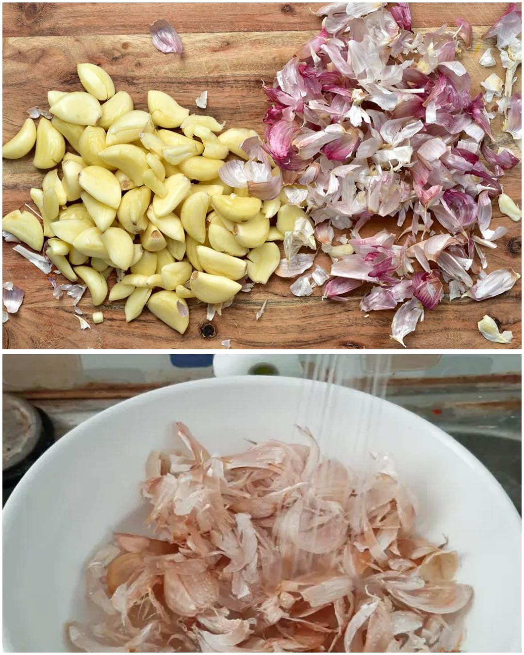 1. Rassemblez les peaux d’environ quatre têtes d’ail (l’équivalent d’une petite poignée).