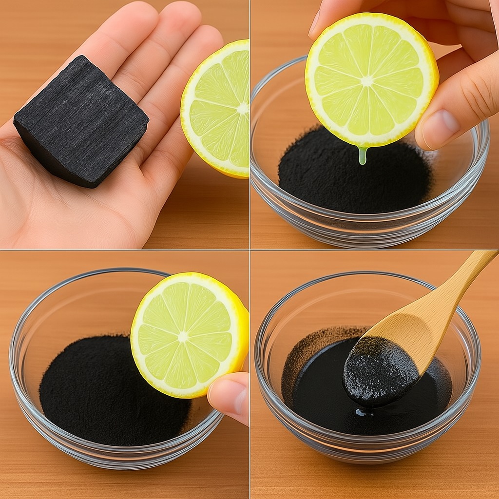 1. **Mélangez de la poudre de charbon avec quelques gouttes de jus de citron et une cuillère à café de miel ou d’eau pour obtenir une texture lisse.**