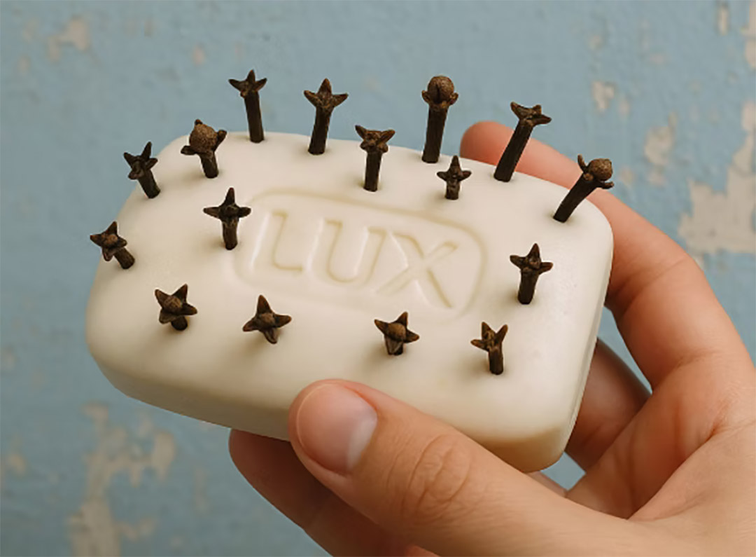1. Enfoncez délicatement les clous de girofle dans le savon, comme pour le piquer.