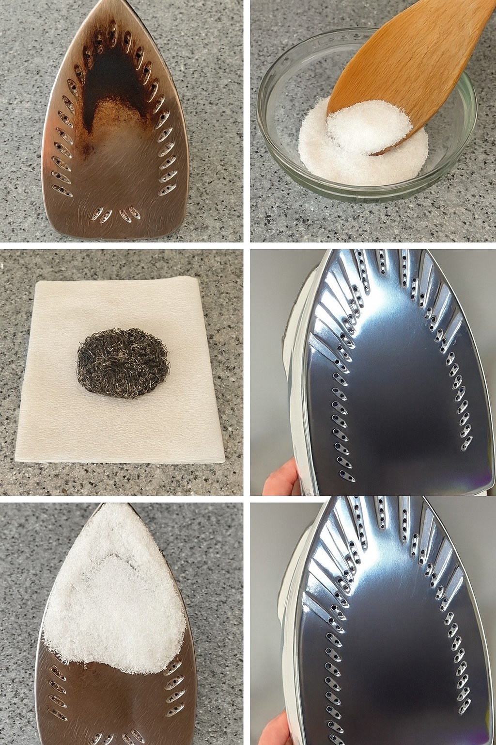 - Mettez votre fer en marche à une chaleur modérée (**sans utiliser la vapeur**) et faites-le glisser lentement sur le sel.