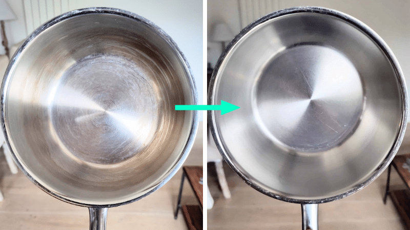 - Étalez une couche généreuse de pâte sur les zones sales (fond de casserole, parois, traces de brûlure).