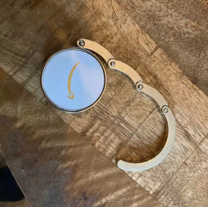 Avez-vous déjà reçu un accessoire métallique dans un sac cadeau, sans aucune indication sur son usage ? Il s’agissait d’un crochet élégant conçu pour suspendre son sac au bord d’une table. Une idée maline pour les endroits où l’espace est limité.
