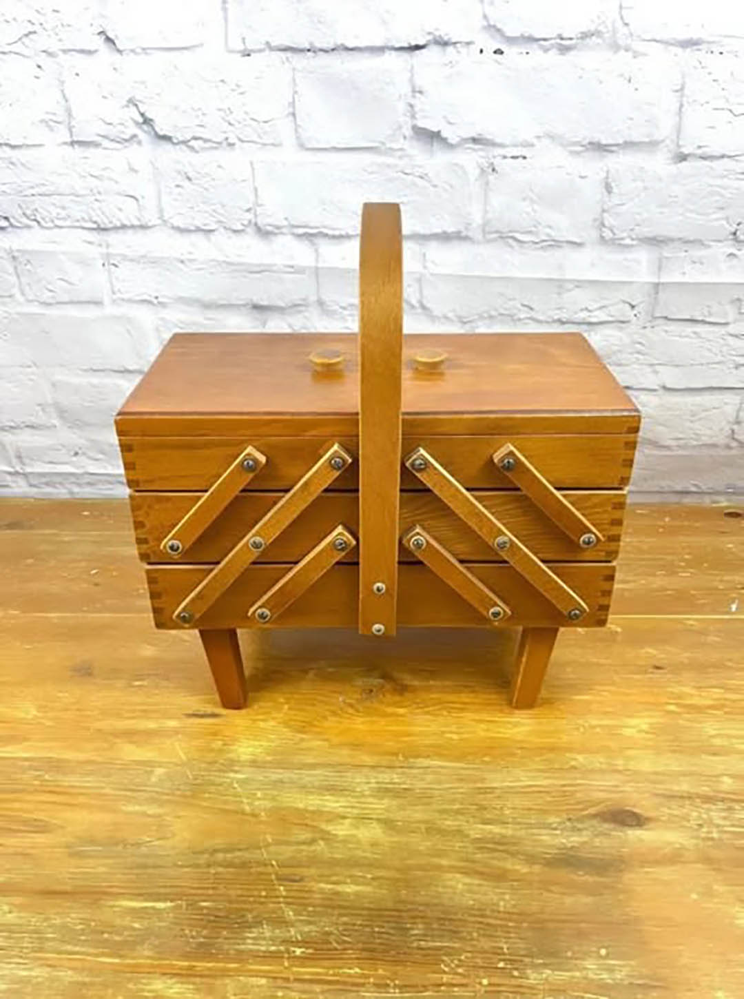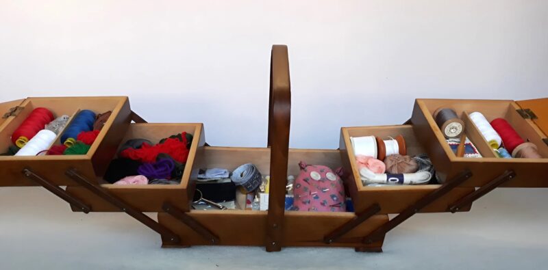 Elle nous a alors expliqué qu’il s’agissait d’une authentique boîte de couture ancienne, un accessoire autrefois essentiel dans la plupart des maisons. À une époque où l’on reprisait ses propres vêtements avec soin, cet objet était le compagnon indispensable des travaux d’aiguille. Chaque alvéole avait son rôle : y loger les bobines de fil de différentes couleurs, les écheveaux, les aiguilles rangées par taille et les boutons soigneusement classés. C’était un petit univers d’ordre et de patience.