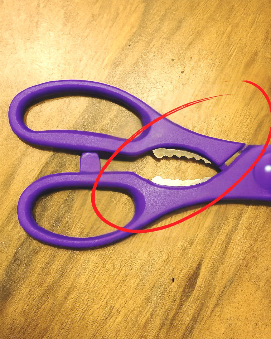 Détail de la partie dentelée entre les poignées de ciseaux de cuisine